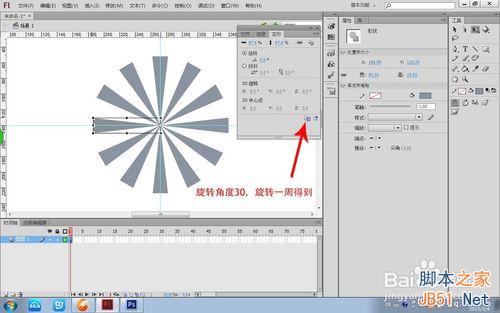 6、再画一个矩形工具,利用变形面板中旋转复制得到图 1的形状。利用椭圆工具画出一个圆与形状1调整好位置叠放得到图2的齿轮。