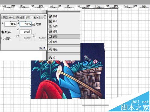 5、图片修改后与原比例不同,如想同比例缩放,可在变形面板中勾选“约束”,更改数值后回车。在视图菜单里调出标尺与网格,拖动选择框,DELETE删去多出的部分。