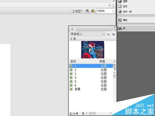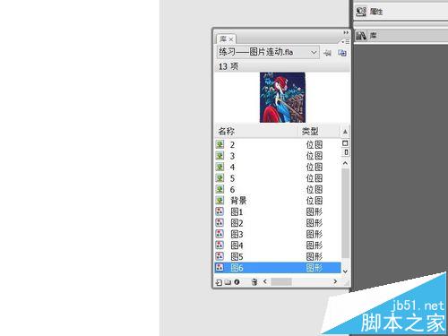 1、首先,将图片导入库中,多少随意,我用了六张,另一张是背景。
