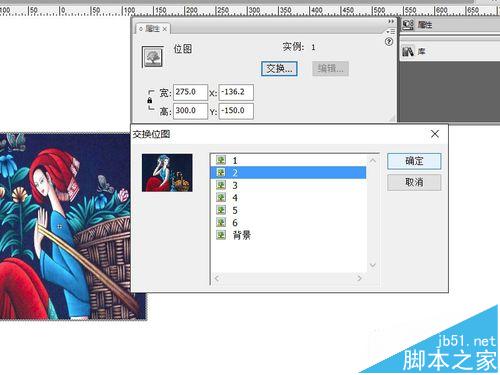 8、双击元件图2,进入该元件编辑,点图片,在属性面板中交换图片。图片右键,分离。依次更改所有图片元件,包括图1的图片分离。