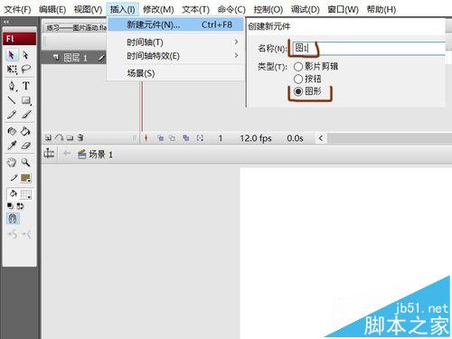 2、将图片变为元件。插入——新建元件——图片,取名图1。