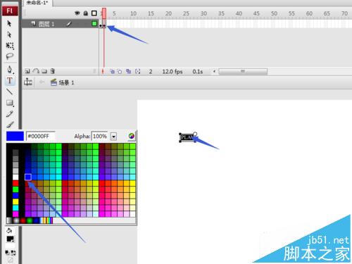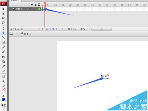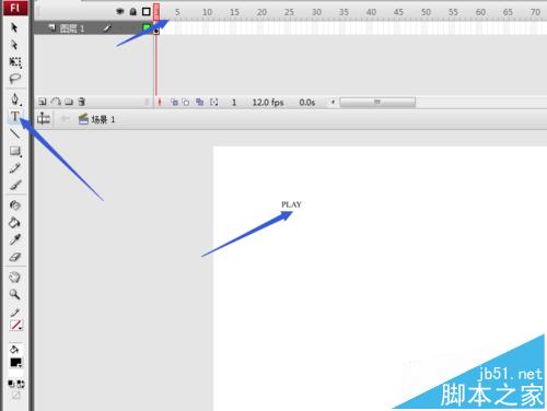 4、第一帧编辑。用文本工具在第一帧点击一下,并在正文空白处写入play,然后可以任意修改其颜色,此处采用黑色。