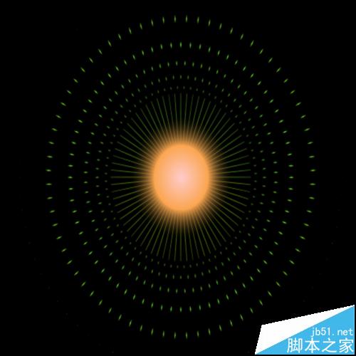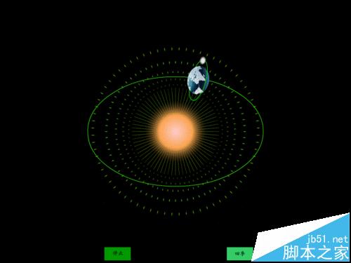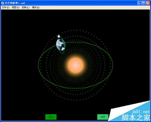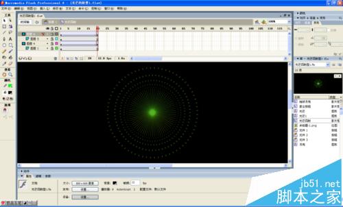 10、回到主场景;共建7个图层,自下而上分别改图层名为“光芒四射、太阳、轨迹、地球月亮”、”引导线“、”按钮“、”四季按钮“,把库中的“光芒四射”元件拖入光芒四射图层的第1帧,全居中,在131帧插入普通桢,上锁。在太阳图层第1帧用椭圆工具,无边框,填充为放射装,增加一个色码,根据自己爱好选择颜色,再把右色码的透明度改为0,画一个正圆,大小为150*150,全居中,在131帧插入普通帧,上锁。