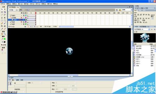 1、打开FLASH8,新建文件,800*600,背景黑色。新建电影剪辑元,起名“地球月亮”。确定后就进入了这个电影剪辑的编辑舞台,放大视图至200%,用椭圆工具,无边框,导入一副事先准备好的地图,按住shift画一个正圆,调整大小为65*65,并全居中,在第10帧插入普通帧。改图层名为“地球”如图