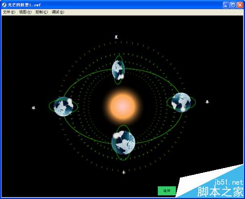13、把库中的“复合按钮”电影剪辑元件拖入“按钮”图层第1帧,放在场景右下方合适的位置,在131插入空白关键帧。在四个“地球月亮”元件的旁边输入“春、夏、秋、冬”四个字。本图层上锁。从库中拖入一个绿色的按钮元件放入“四季按钮”图层第1帧的场景右下方合适的位置,在按钮上输入“四季”两个字,在131帧插入关键帧,把按钮上的“四季”两个字改为“返回”两个字,选中第1帧上的四季按钮,输入以下语句:on (release) {_root.地球.play();gotoAndPlay(131);}