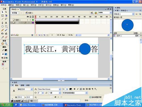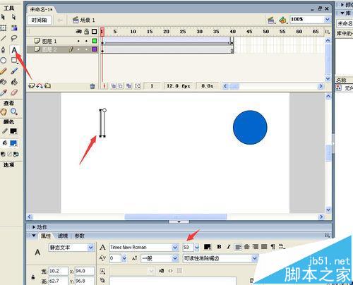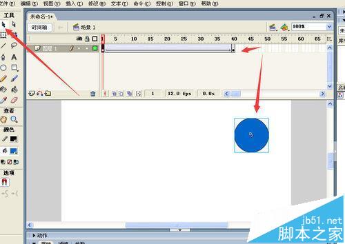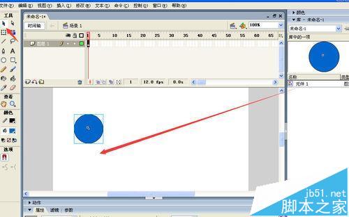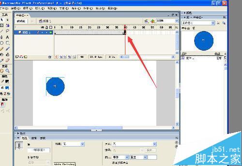 2、在后台画一个小球,回到场景,将小球从库中拖动出来到左边,在40帧处右键,建立关键帧。