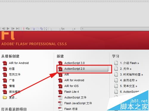 1、启动flash cs5,执行文件-新建命令,在弹出的窗口中选择新建一个基于actionscript2的flash文档。