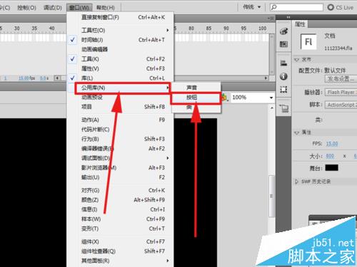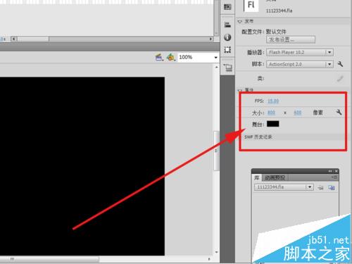 2、找到属性窗口,修改编辑区的大小为800*600像素,帧频为15fps,背景色为黑色。
