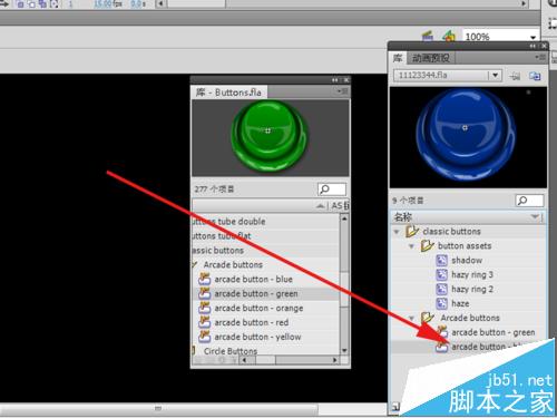 3、执行窗口-公共库-按钮命令,在弹出的公共库窗口中找到classic buttons文件夹,在该文件夹中将按钮arcade button - green和arcade button - blue拖拽到库中。