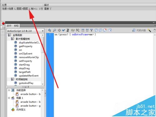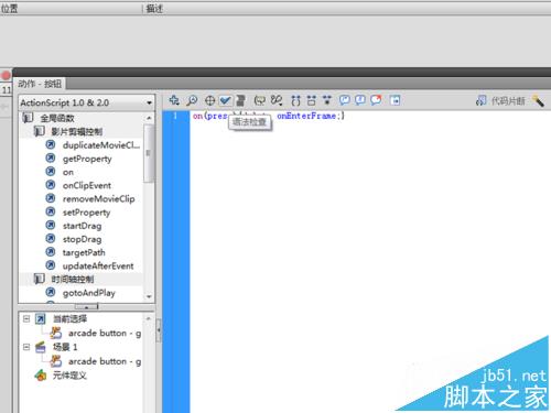 5、在舞台上选择arcade button - green按钮,右键单击该按钮在弹出的对话框中选择动作选项,打开动作面板,然后输入代码on(press){delete onEnterFrame;},同时检查语法是否有错误。
