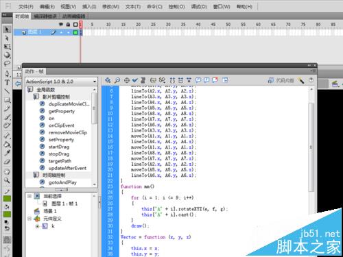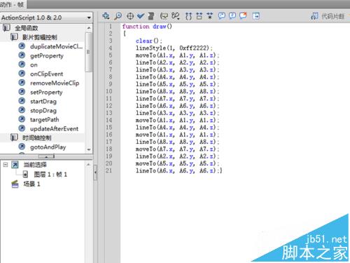 7、选择图层1的第一帧,右键单击从下拉菜单中选择动作,打开动作面板,在该面板中输入代码,一段关于画图的函数代码。