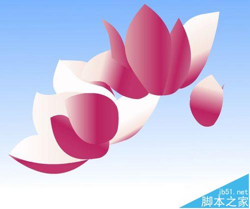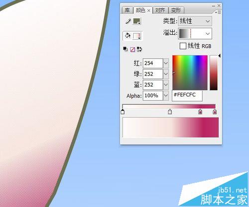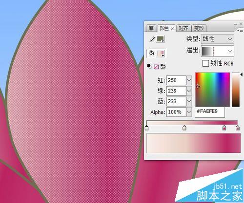 3、颜色面板中,选线性填充色,填充条设置如图。色标码由左至右分别为#FEFCFC、#F7E3DC、#C02762、#C5376D。为左右两侧打开的花瓣填充上颜色。