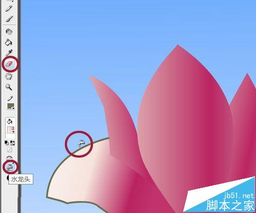 7、橡皮工具选中水龙头,在线条上点击,去除线条。