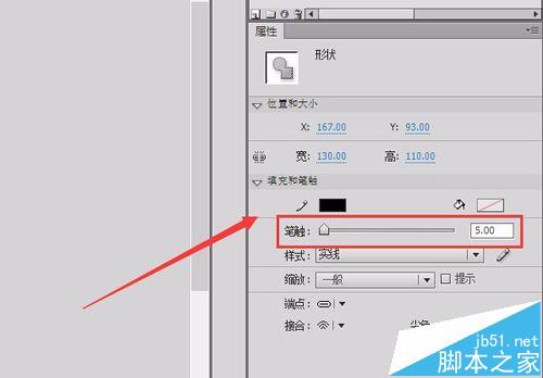 5、可以看到笔触的线条太细了,用选择工具选择椭圆,在属性面板里将笔触设置为5,如图所示: