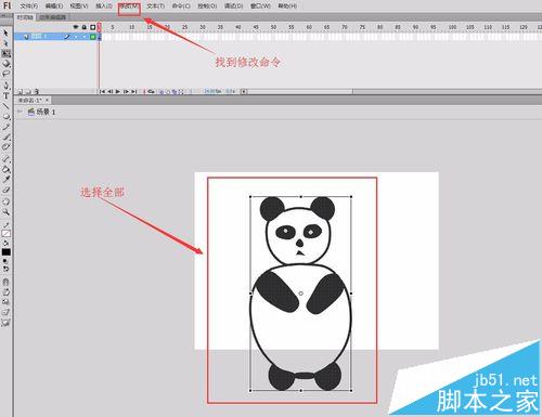 15、在修改菜单里找到变形命令,在变形命令里找到缩放命令,对我们的卡通熊猫进行缩放操作,并移动到适当的位置,如图所示: