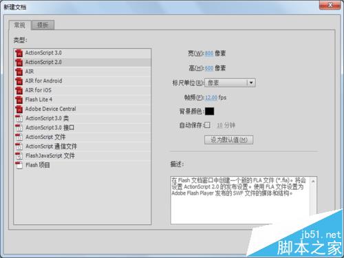 1、启动flash cs5,执行文件-新建命令,新建一个基于actionscript2.0,大小为800*600,帧频为12fps,背景颜色为黑色的文件。