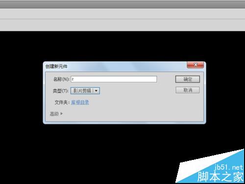 3、执行插入-新建元件命令,在弹出的对话框中输入名称为”z“,类型选择为影片剪辑,点击确定按钮进入编辑区域。