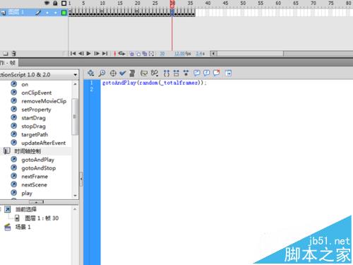 8、选择第一、十、二十、三十帧,按f9键打开动作面板,分别输入代码“gotoandplay(random(_totalframes))”脚本。