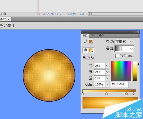 2、鼠标选择圆形的填充色,颜色面板里将填色类型选为放射状,填充条如图设置。色标由左至右分别为:#FDF2B4、#F7B636、#D1870E、#A66223。