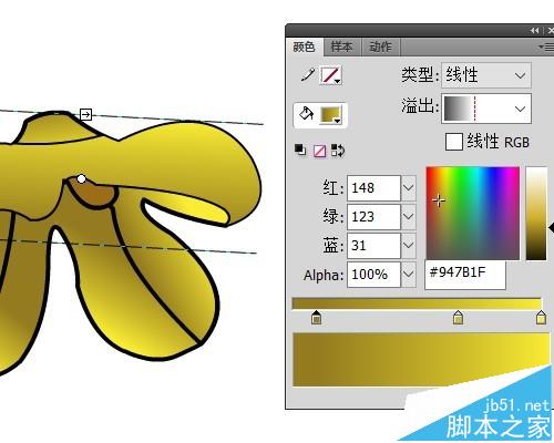 2、填充色选渐变填充,类型线性,为每一个花瓣填充上颜色。F键调出渐变填充工具调整渐变色的位置、大小等。中心填上浅棕色。