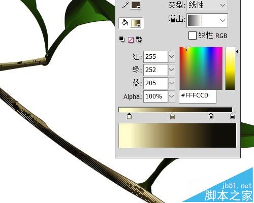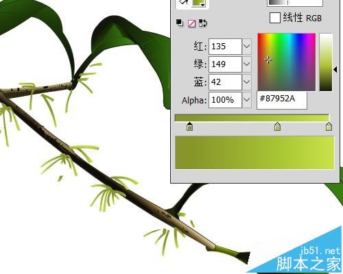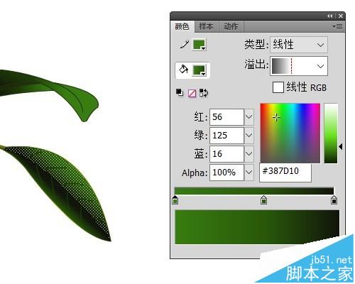 2、填充色如图设置,填充上渐变色,渐变工具调整渐变色大小、位置。注意,虽是同一种填充色,但是因所处位置不同,则三个色标中的某一个会占的面积大些,比如叶子背面,基本是深色,则需将填充色拉大,再将深色拖至整个背面。