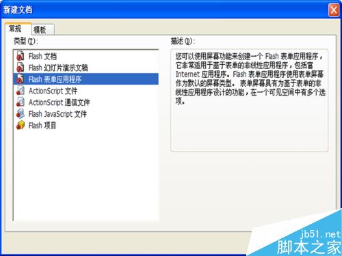 1、启动flash 8,执行文件-新建命令,在弹出新建文档对话框中选择法拉盛表单应用程序选项,点击确定进入主界面。