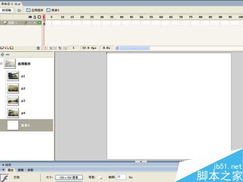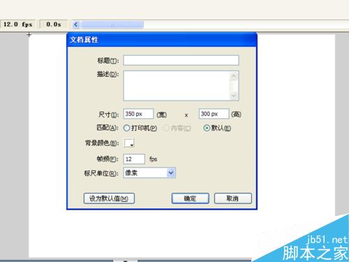 2、点击属性,在属性对话框中设置大小为350*300像素,帧频为12fps,背景颜色为白色。