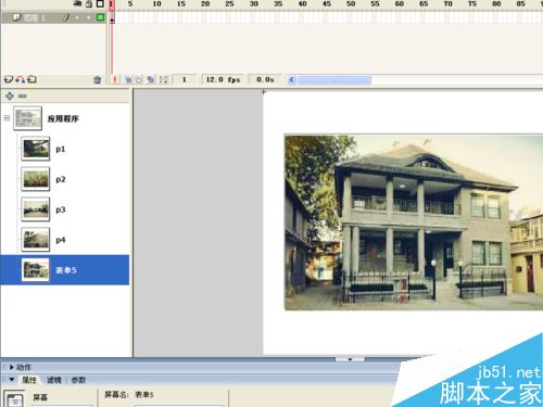 7、依次选择屏幕p2-p4,并将库中的图片2-4依次拖拽到舞台中,并设置其对齐方式为居中对齐。