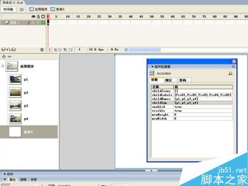 8、选择表单5,选择库中的accordion组件拖拽到舞台上,设置其大小为350*300像素,并设置居中对齐。