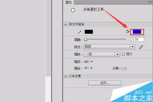 3、点击多角星形工具,在属性里点击选项,弹出工具设置对话框,在工具设置对话框内将边数设置为3,如图所示: