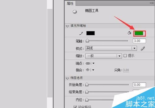 14、在工具箱里找到椭圆工具,并在属性里设置填充色为绿色,如图所示: