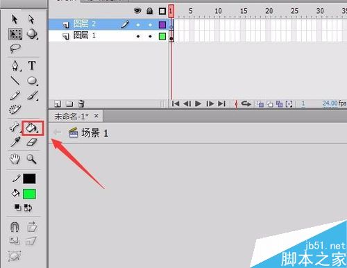 11、在工具箱里选择油漆桶工具,在属性里修改填充色为深一点的黄色,如图所示: