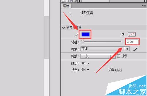 9、选择直线工具,在有的属性里调节直线的颜色为蓝色,笔触大小为3,如图所示: