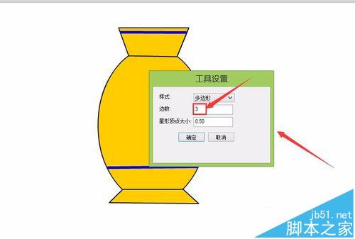 12、选择多边形,在右侧的属性里点击选项,弹出工具设置对话框,调节边数为3,