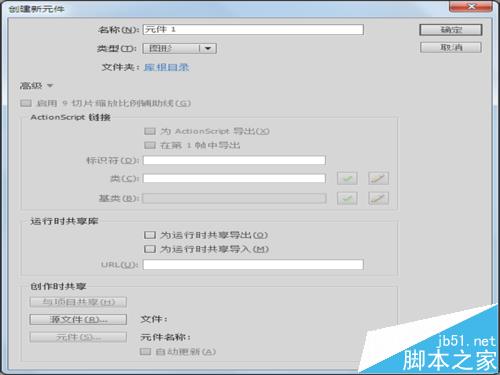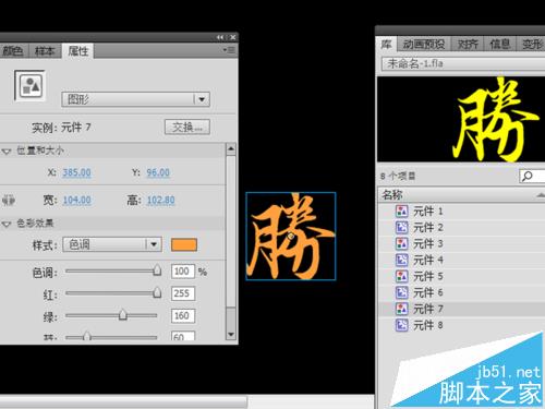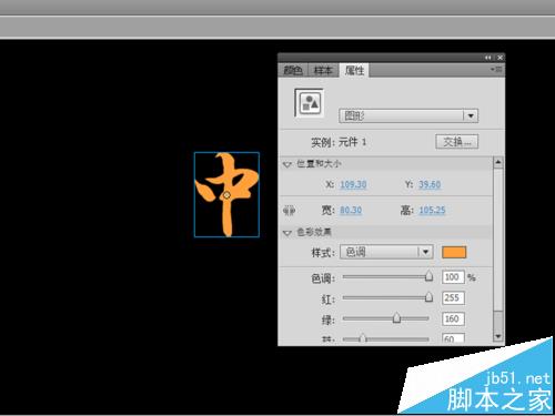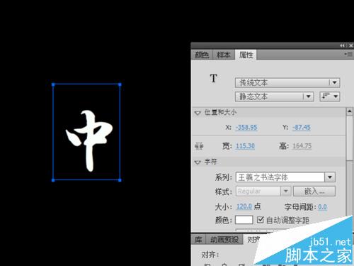 2、执行插入-新建元件命令,新建一个名称为元件1的图形元件,确定后进入编辑区域,选择文本工具输入文字“中”,设置字体为王羲之书法字体,大小为120.