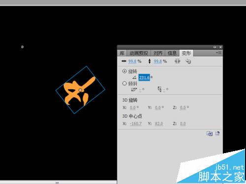 6、按ctrl+f8组合键新建一个名称为元件9的影片剪辑元件,确定后进入编辑区域,将影片剪辑元件2拖拽到舞台,打开变形工具窗口。