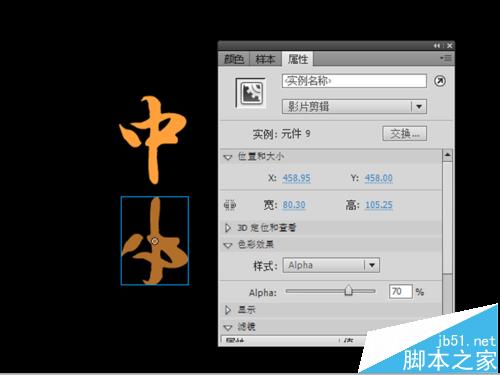11、选择图层2中的元件,执行修改-变形-垂直翻转命令,并设置其alpha值为70,查看效果。