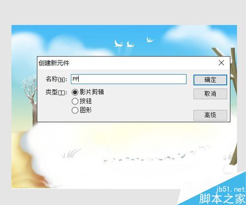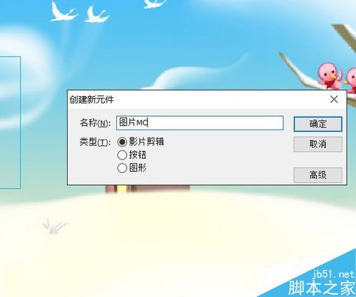 2、背景图拖入层1。新建一层,Ctrl+F8创建新元件。类型:影片剪辑。