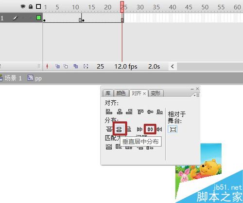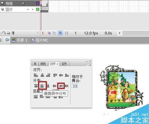 3、在帧1、12分别按下F6键插入关键帧。放入维尼与小猪的两张图片,对齐面板中选择垂直居中分布、水平居中分布。24帧按下F5插入帧。