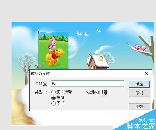 4、将元件拖入场景中,F8将影片剪辑转换为按钮元件,取名P1。双击进入编辑。