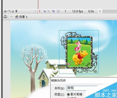 6、回到场景,将该元件再次转换为影片剪辑。双击进入编辑。