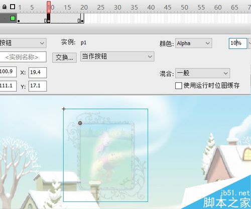 8、属性面板中将帧1、20按钮元件的透明度改为0%,帧10的按钮透明度改为10%。