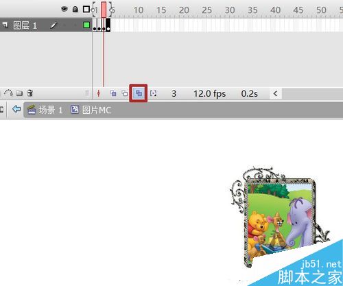 3、删除三帧中的P1元件,点开编辑多个帧,分别从库中拖入另外三张图片放入,并使之与第一帧按钮对齐。所以最初做第一个元件时使每一个图片与舞台居中对齐,在此时会很方便,只要再次选择将每一个图片、元件都居中分布,自然会对齐。当然,这里的图片事先都处理成同样大小。