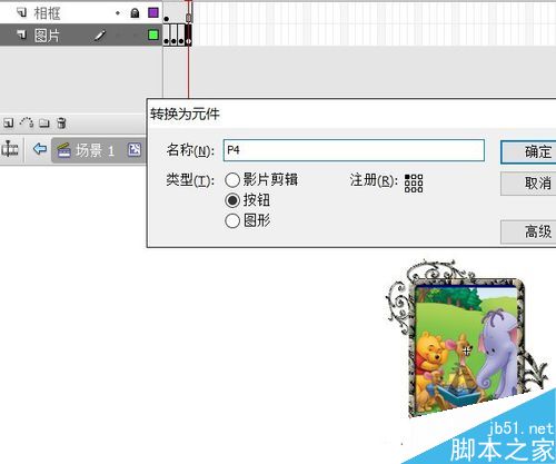 5、将后三帧中的图片转换为按钮元件,分别命名为P2、3、4。