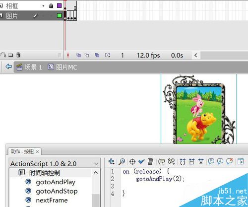 6、为第一帧的按钮写上:on (release) {gotoAndPlay(2);}后面三个按钮分别将数字2改为3、4、1。即点击该按钮分别进入帧2、3、4、1并播放。