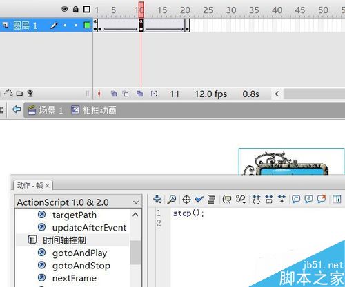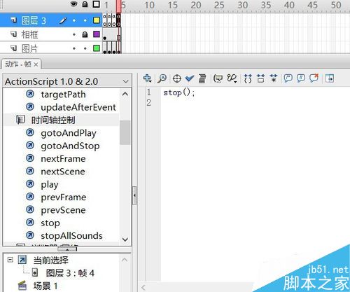 7、新建一层,插入四个关键帧,并在每帧上写入stop();使MC不会自动播放。