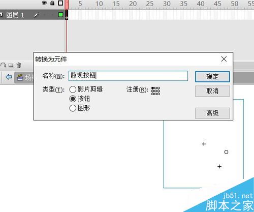 8、创建一个影片剪辑元件,第一帧拖入“隐现”MC,转换为按钮元件。居中对齐。