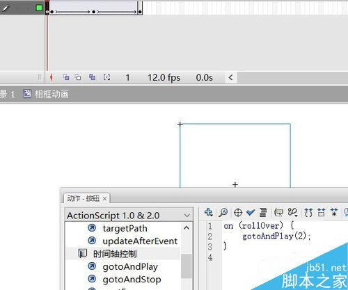 11、为帧2、11创建补间动画,为帧1的按钮写上on (rollOver) {gotoAndPlay(2);},帧12的按钮写上on (rollOut) {gotoAndPlay(12);}