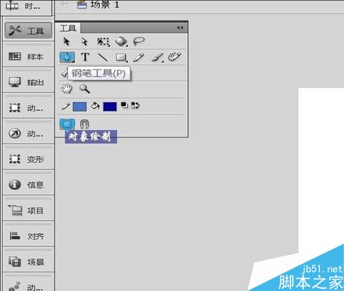 1、新建文档,用{工具}面板上的[钢笔]工具,并启用[对象绘制]功能。在舞台上绘制出地面形状。如图。