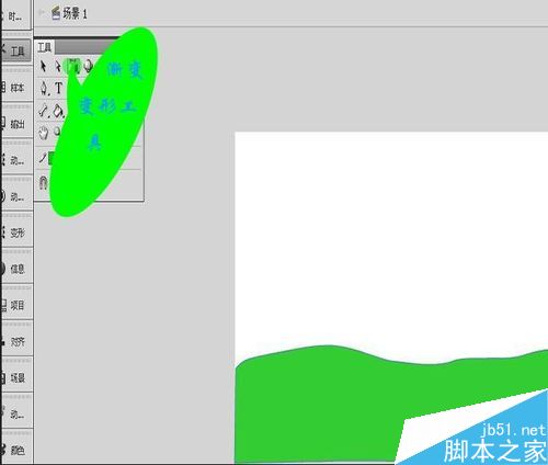 2、使用[填充颜色]控件和[笔触颜色]控件,设置地面颜色为绿色,然后再使用[渐变变形工具],更改其渐变颜色的方向和范围,如图。